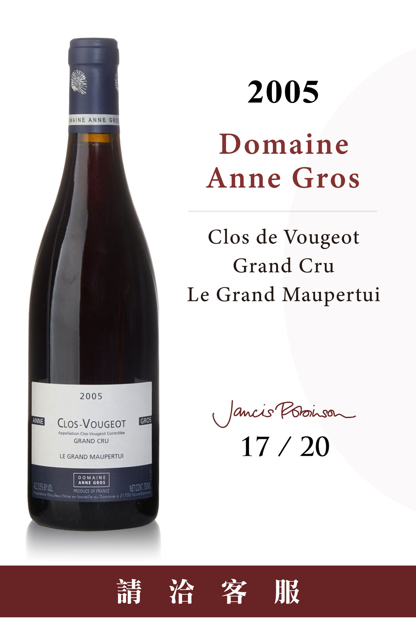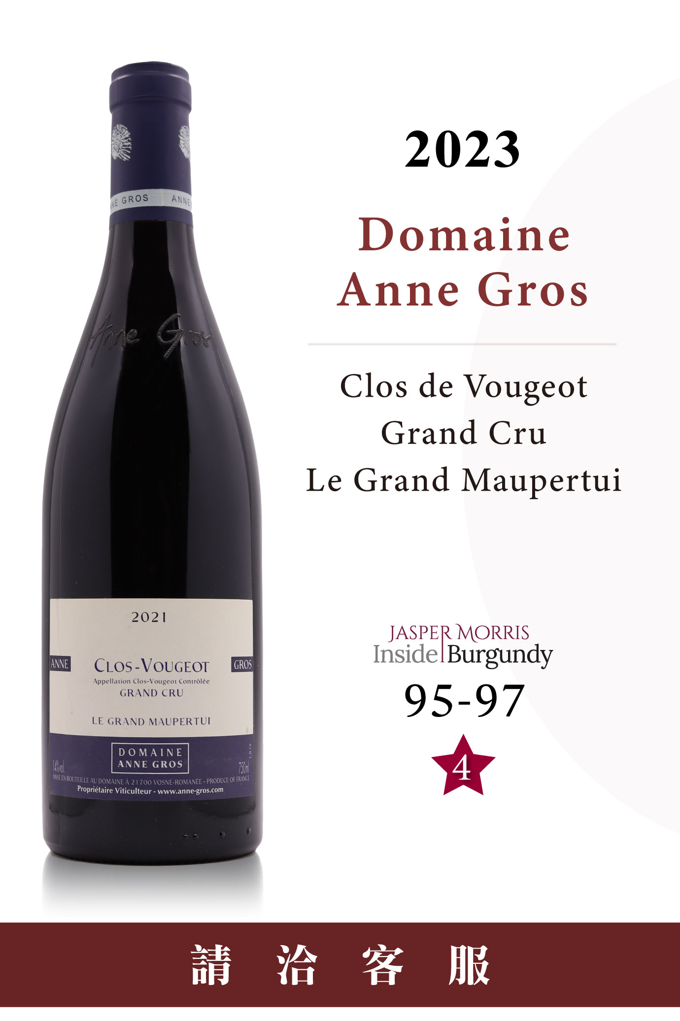 在Anne Gros的詮釋下,Le Grand Maupertui並非以張揚取勝,它的優勢在於穩定而深邃的結構。對於希望在Clos龐大版圖中精準佈局的藏家而言,Le Grand Maupertui是一款能兼顧力量、細節與陳年潛力的選擇。
