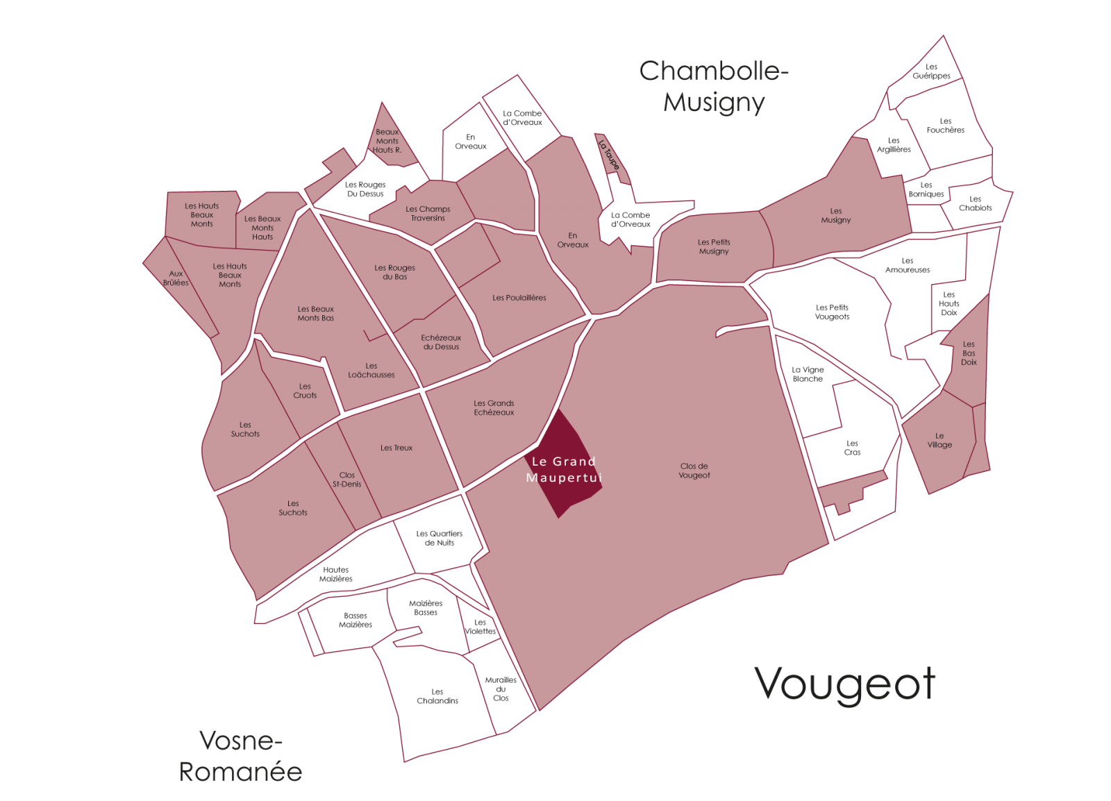 相較於下坡較為厚重的土層,此處排水條件更佳,成熟度表現穩定,既能保有上坡區域的張力,也具備中段應有的結構厚度。正因如此,Le Grand Maupertui往往展現出骨架清晰、層次分明且延展度良好的特質,在Clos de Vougeot這片龐大而多樣的特級園版圖中,確立出自身明確而具辨識度的風土定位。