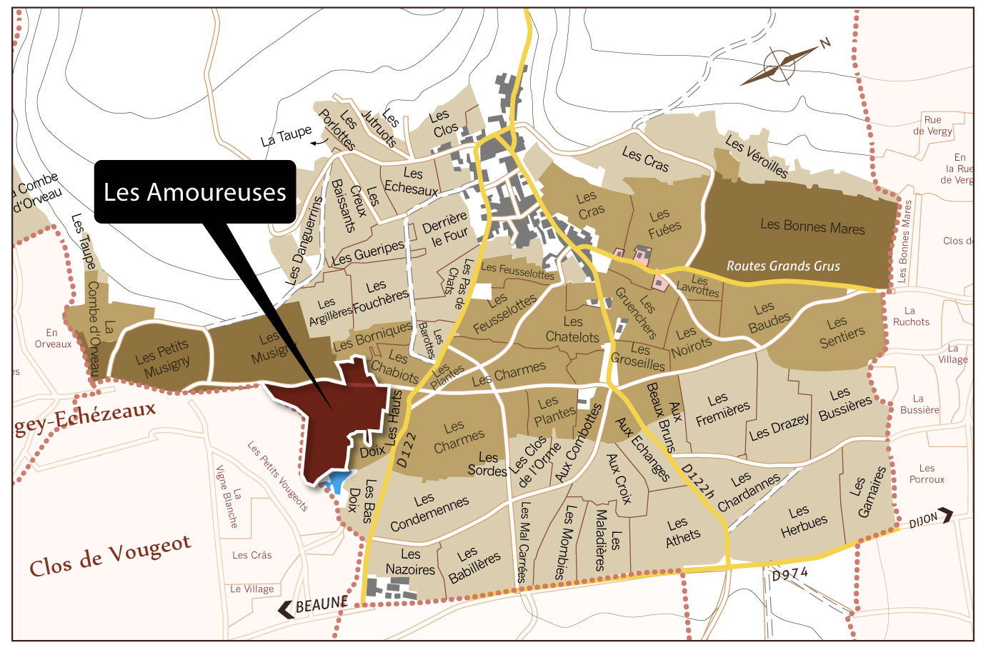若說Musigny特級園是Chambolle-Musigny村戴在頭上、傲視群雄的王冠,那麼Les Amoureuses(愛侶園)便是綴在耳畔,那一顆最為優雅溫潤的珍珠。 Les Amoureuses(愛侶園)一側緊貼著說Musigny特級園的下坡處,另一側向Vougeot村延伸,兩者共享著相同的地質精華。在藏家心中,愛侶園從不甘於人後——它是Musigny威嚴之外最極致的溫柔,是凌駕於法律分級之上的傳奇。 極致風土|石灰岩上的精靈舞步Les Amoureuses(愛侶園)的卓越,源於其精確到近乎苛刻的地理構造。這塊約5.40公頃的坡地,坐落於Chambolle-Musigny村南端,其風土結構與相鄰的特級園Musigny共享靈魂,卻展現出更為靈動的特質。 Les Amoureuses地圖位置 (圖/天地人酒窖) 這片位於海拔約260至270公尺的坡地,上段以緻密堅硬的Comblanchien石灰岩為骨架,屬於巴通階石灰岩體系;下段則逐漸過渡為泥灰岩比例較高的土壤結構,使這塊名園在纖細與深度之間,展現出格外迷人的張力。由於土層貧瘠,葡萄藤必須深扎進石灰岩層的縫隙中汲取養分與水分。這種極端的生長環境賦予了酒液鮮明的礦物質感與高亢的酸度。 Les Amoureuses表層土壤 及石灰岩結構的風土 (圖/weinrouten.de) 而這片呈東向與東南向坡面,能完美捕捉清晨的第一道陽光,確保果實緩慢而完整地達到生理成熟度。緊鄰的Vougeot谷地帶來的涼爽微風,延緩了果實的熟成,維持了香氣中標誌性的紫羅蘭、牡丹與野生紅莓的優雅清透感。 前景的Les Amoureuses 與遠處的Clos de Vougeot (圖/weinrouten.de) 如果說Musigny展現的是國王般的“力量”,Les Amoureuses則定義了靈魂最深處的“純淨”:單寧細膩得幾乎透明,卻擁有極強的張力。讓人驚覺此刻品嚐的已不只是一瓶酒,而是一場發生在味蕾上的法式熱吻。 泥土與戀人的纏綿Les Amoureuses,法語意為「戀人們」。這個浪漫至極的名字,並非僅是文人的臆測,而是深植於這片土地的感官記憶。 根據勃根地葡萄酒公會(BIVB)的迷人解釋,這個名字源於農人對土地最直觀的體會。Les Amoureuses由薄層黏土覆蓋於緊密的石灰岩之上,每逢雨後,土壤變得極具黏性,緊緊依附在行經者的鞋底。當地酒農會幽默地感嘆:「這片土地戀上了我的鞋子。」這份來自地層深處的「依戀」,成了愛侶園最樸實卻生動的由來。 另一種流傳更廣的說法,則是指向其卓越的酒質——「酒中有愛」。愛侶園產出的酒液,兼具馥郁的香氣、奔放的生命力與飽滿的汁感。這種充滿張力與誘惑的風格,如同與戀人的深情對話,讓人沉溺其中。 |