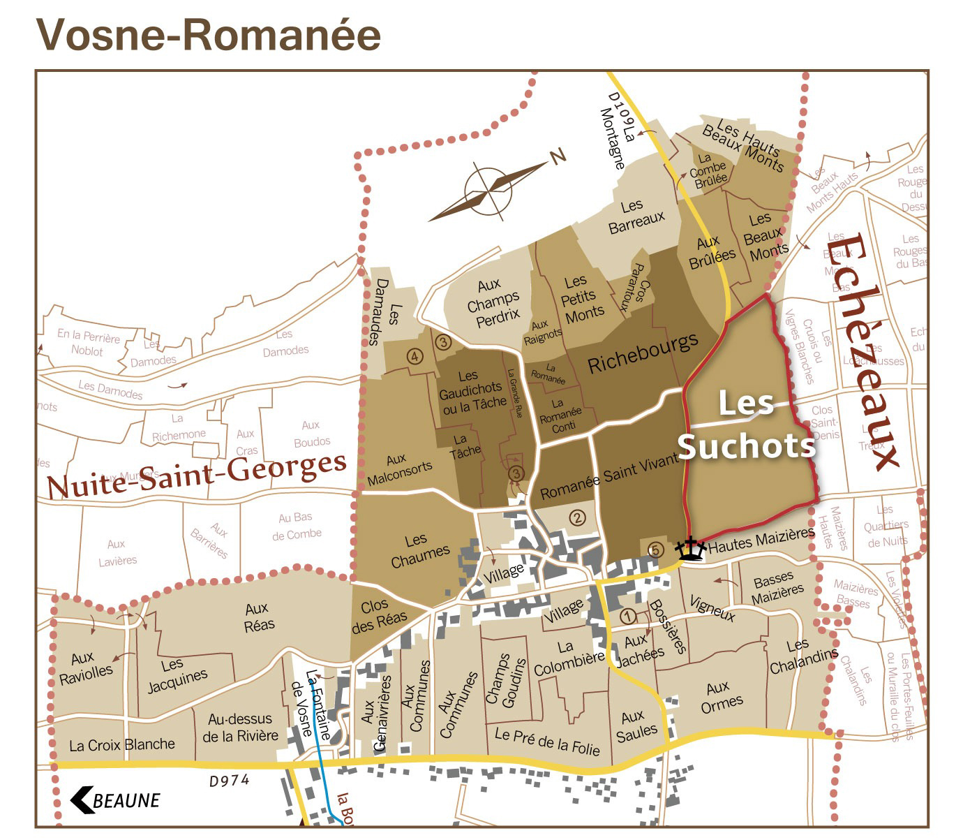 在勃根地迷的心中,Vosne-Romanée是星光最璀璨的銀河,而Les Suchots(蘇秀園) 這片一級園則座落在這條銀河最核心的地方。這片13公頃的葡萄園天生就是一座百家爭鳴的舞台,同一個園名,卻能有多種風格表現。 地圖上最奢侈的鄰里關係翻開地圖,你會驚嘆於大自然的偏心,Les Suchots(蘇秀園)竟被一眾傳奇特級園環繞:北面緊貼著宏大的Échezeaux,南面則與風範高雅的Romanée-Saint-Vivant與壯闊的Richebourg比鄰而居。 Les Suchots地圖位置 (圖/天地人酒窖) 在收藏家眼中,這裡不只是一片一級園,它更像是特級園光環之下那處「暗藏的寶室」;在法規制度上它是一級園,但在杯中卻常展現出更接近特級園的重量與深度。 開墾者的印記Les Suchots一詞指的是樹樁,這個命名也紀錄了百年前這裡曾是一片幽深林地的身世。那時的開墾者,必須在堅硬的岩層中一根根拔除深埋的樹根,才能讓葡萄藤扎根於此。 Les Suchots葡萄園 (圖/gerard-mugneret) 而這個命名也在告訴大家,這座名園的起點,不是浪漫,而是一段把森林讓位給葡萄藤的真實歷史。當杯中的辛香與花香綻放時,那是這片土地在經歷百年沈澱後,對汗水最溫柔的回響。 眾多靈魂交織的風土大賞Les Suchots(蘇秀園)是Vosne-Romanée村面積最大的一級園,廣達約13公頃的疆域,讓這片土地擁多元的微觀地質,同時也因為有眾多的持有者,讓這片葡萄園擁有百變的風格。 而Winehog主筆人Steen Öhman也提到:「Les Suchots(蘇秀園)最迷人的切入點不是一級園是否接近特級園,而是它其實分成性格鮮明的兩個區段。」他也明確指出,上半部的複雜度高於下半部。 |Les Suchots上半部上半部的位置在Les Beaux-Monts下方,土壤更「輕」,因此酒往往更顯礦物感與空氣感,結構也更自然;在最佳狀態下,這裡的酒甚至能把品質高度拉到「一支好的 Échezeaux」那個層級。 若把Les Suchots想像成同一張門牌,這裡就是「樓上」:香氣更輕盈地往上飄,線條更細,尾韻的亮度更高。 Les Suchots上半部地塊分佈 (圖/winehog.org) 代表酒莊: Domaine de L'Arlot Domaine Boigey Freres Domaine Arnoux Lachaux Domaine du Comte Liger-Belair