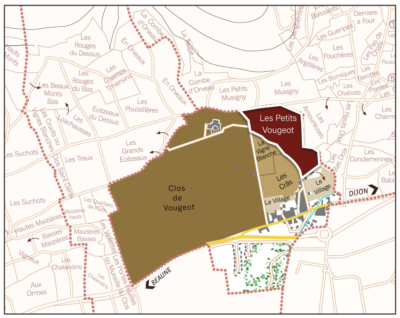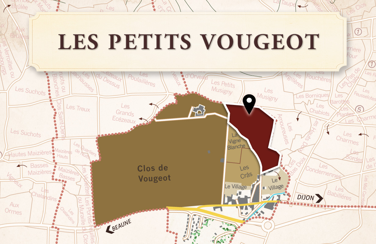 小知識:Les Petits Vougeot的命名之謎 這塊地的命運與一條名為 "la Petite Vouge"(或稱la Vougeotte)的小溪源頭緊緊相連。這條溪流性格孤傲,平時經常乾涸,只有在暴風雨過後、連日大雨或是冬末冰雪消融時,清澈的泉水才會從這塊地底噴湧而出。