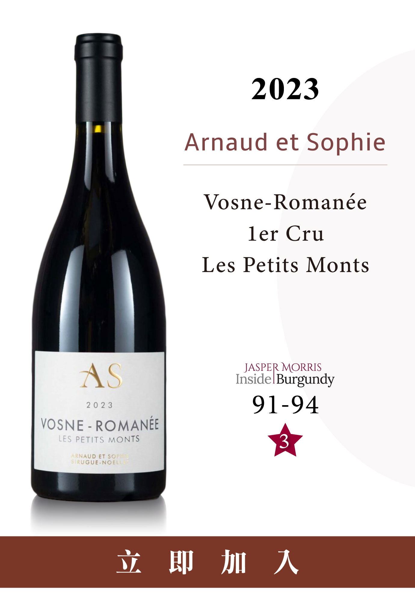 血統的匯流: 當Sirugue遇見NoëllatArnaud et Sophie的崛起,是兩支勃根地血脈的融合。Arnaud Sirugue承襲家族酒莊Domaine Robert Sirugue的地塊,而妻子Sophie Noëllat則背靠名門Domaine Michel Noëllat。這對夫妻的共同計畫早在2016年便正式啟動。當時,這是一場帶有實驗色彩的獨立運作,敘事起點並非高不可攀的特級園,而是緊鄰傳奇地塊Cros Parantoux與Les Petits Monts的村莊級名園—Les Barreaux。 Sophie Noëllat(左)與丈夫Arnaud Sirugue(右) (圖/winehog.org) 從2016年至2022年,Arnaud et Sophie以微型酒莊的姿態逐漸擴大規模。這段期間,Arnaud一方面維持著獨立計畫,另一方面仍處於父親Jean-Louis輔助下,參與家族大酒莊的運作。直到2023年份迎來決定性轉折。 2023年份起,Arnaud開始單獨釀造Sirugue體系酒款,並以Arnaud et Sophie標籤對外推出。2023年不僅是他首度脫離父輩羽翼、執掌釀造的元年,更是酒莊進入全盛期與品牌全面整合的歷史里程碑。這種權力的斷代與回歸,讓作品在市場呈現截然不同的感官維度。 五年的轉運期:產權博弈勃根地土地不乏故事,Arnaud et Sophie目前面臨精密且具期限的過渡期。根據家族協議,2023年至2027年可視為家族品牌與葡萄園資源整併下的五個過渡年份,原隸屬Robert Sirugue名下的地塊將在此期間統一冠以Arnaud et Sophie之名。 Arnaud et Sophie在Les Barreaux葡萄園採收情景 (圖/sirugue_noellat instagram) 然而,這座占地12公頃的版圖並非靜止。5年合約期滿後,Marie-France Sirugue的女兒Marie-Paule Reynaud將索回部分家族份額。2023年份不僅是Arnaud獨立執釀的開端,也是獲取該酒莊目前完整風土版圖的契機。這種具時效性的稀缺性,進一步推升Arnaud et Sophie在精品交易市場的討論熱度,使其成為近期矚目的現象級酒莊。 空間與技術的提純: 在Anne Gros的鄰里間進化在Vosne-Romanée中心,緊鄰Anne Gros農機庫後方的新酒窖,已成為Arnaud et Sophie的技術中心。儘管2023年份仍在舊廠發酵,但這處新空間的啟用,具體展現了酒莊追求純淨風格的堅定決心。 Arnaud的釀造哲學核心,在於對整串發酵比例的靈活運用。在氣候變暖背景下,他並未追求高成熟度與高酒精度,而是透過整串發酵引入的草本清香與骨幹,消解溫室效應帶來的沉悶感。配合節制的新桶使用,Arnaud et Sophie的2023年份展現出具備呼吸感的質地。風格轉向讓酒液在口中呈現輕盈、如絲綢般的觸感,而非傳統定義下的提取與堆砌。 Arnaud et Sophie新落成的酒窖 (圖/sirugue_noellat instagram) Arnaud et Sophie不僅是兩個傳承家族的重組,更是勃根地新一代酒農在傳統權威面前發出的美學宣言。Arnaud et Sophie Sirugue-Noëllat避開刻板重裝桶與厚重提取,追求具備「空氣感」與「精確度」的現代風格。 |