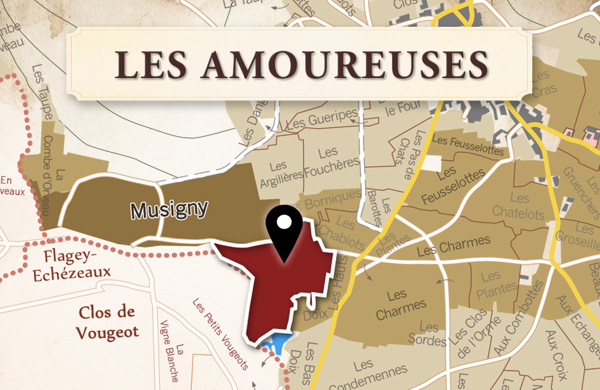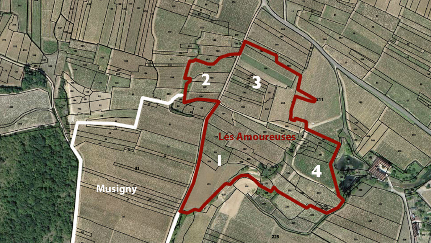 順著衛星疊圖上的紅線,Les Amoureuses被清楚分成四個小區塊:南側靠Musigny Grand Cru的上段是坡勢最挺、也是名莊集中之處。第二段位於通往Clos de Vougeot小路之上,緊鄰Musigny北側;再往北貼近村莊,是第三段較為溫和的中坡;最後則是一路滑向 Vougeot 的下段,坡勢持續下降,視野打開,風土也漸漸過渡到泥灰岩比例較高、口感更圓潤的一面。