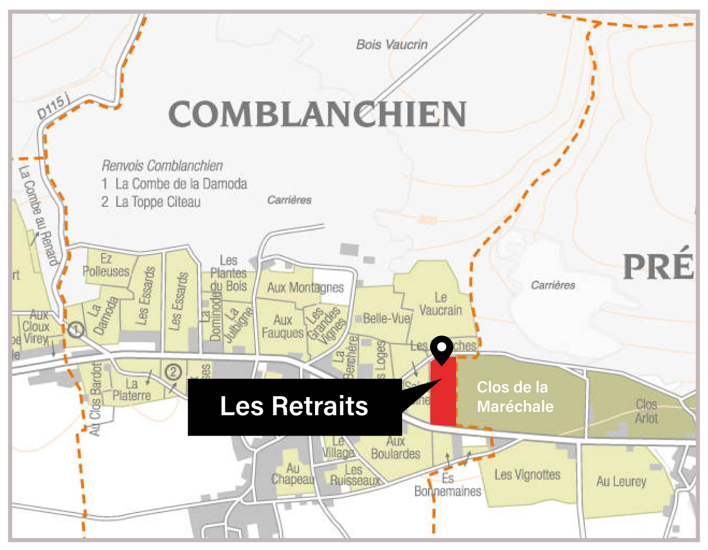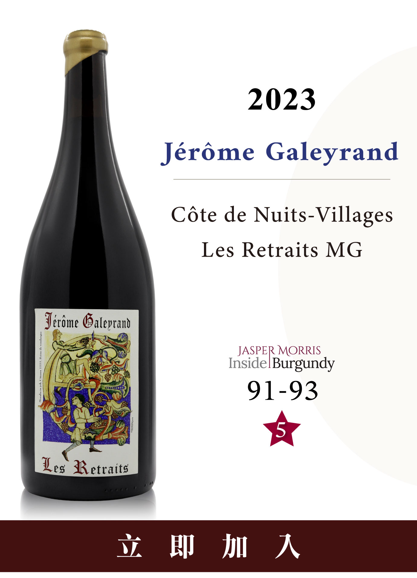 Les Retraits地塊緊鄰Chambolle-Musigny,地理邊界與名園La Combe d'Orveau相接。這裡有分別植於1925年與1932年的老藤,樹齡將近百年。這些老藤在2023年這個充滿活力的年份中,展現出極致的集中度與細膩的礦物脈絡。Les Retraits本就一瓶難求,Magnum大瓶裝更是鳳毛麟角,能收到已是緣分!