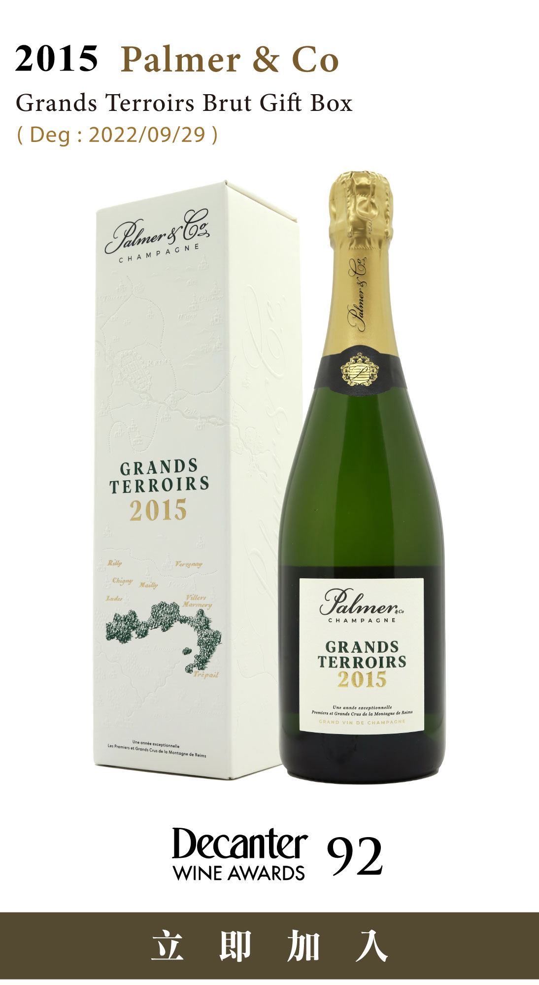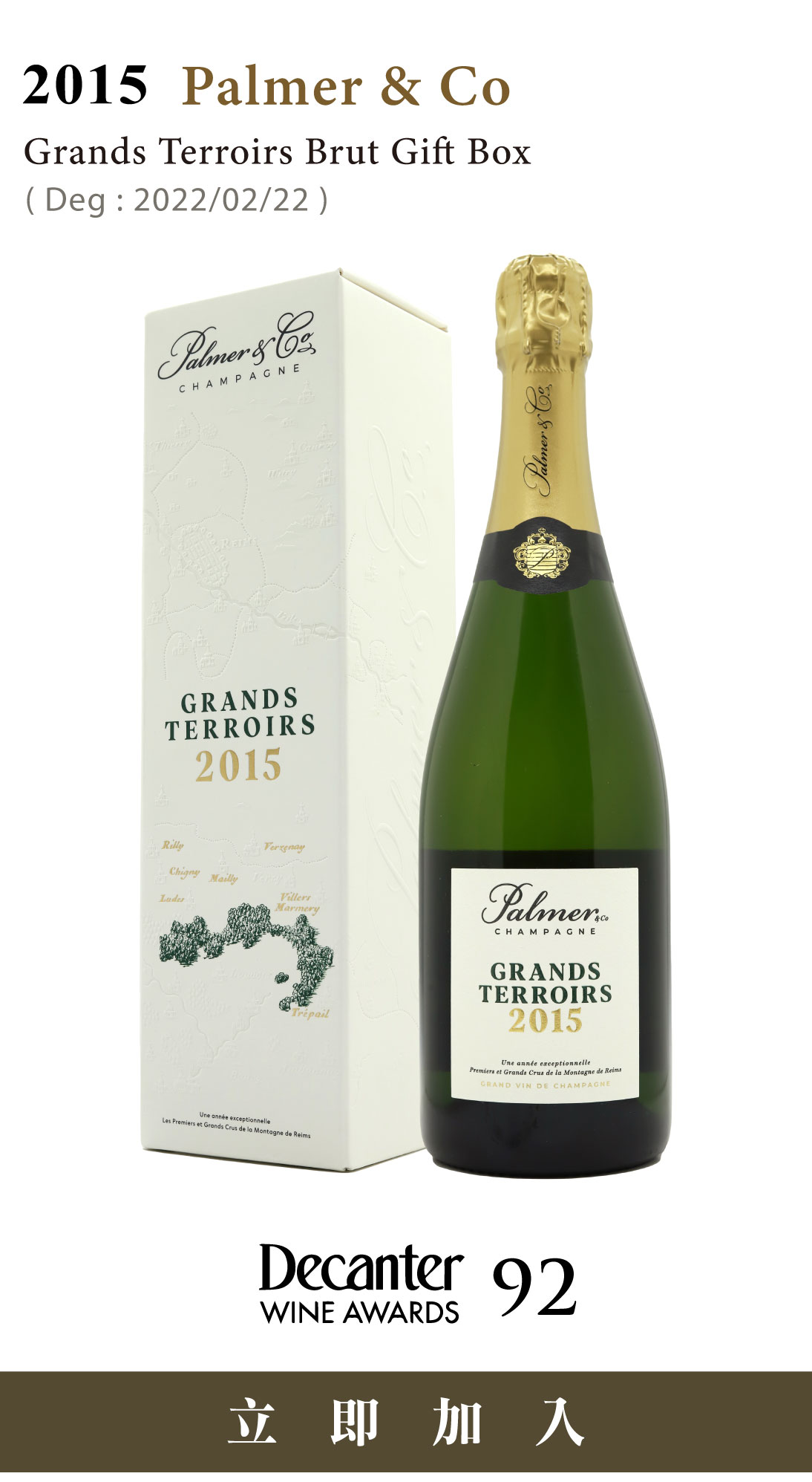 年份香檳(Vintage Champagne)向來是釀酒師對特定氣候的一次公開表態:只有當他們認為這一年的果實足以獨立說話,才會做出年份裝瓶的決定。2015年,Palmer & Co決定讓這個年份為自己說話。 極端年份的考驗從萌芽到採收,2015年是香檳區有氣象記錄以來最炎熱的生長季節,超越了此前普遍被視為極端高溫標竿的2003年與1976年。持續的乾燥、充沛的日照,使得葡萄在累積高度成熟度的同時,也面臨前所未有的生長壓力。 這樣的年份對釀酒師而言既是禮物也是考驗。所幸當年8月下半月迎來了涼爽夜晚,日夜溫差為葡萄保留了健康的酸度,使得2015年份的基酒豐富、複雜且極度平衡。 偉大風土的非凡張力Grands Terroirs並非泛泛之作。酒款的名字本身即是一種宣示:它所呈現的,是Palmer & Co在蘭斯山(Montagne de Reims)一級與特級葡萄園的精華所在。 2015 Palmer & Co Grands Terroirs調配比例: |50% 夏多內,來自 Trépail 與 Villers-Marmery |38% 黑皮諾,來自 Mailly 與 Verzenay |12% 莫尼耶,來自 Ludes、Chigny-les-Rosé 與 Rilly-la-Montagne 經歷了長達6年的瓶中帶渣陳年後,最終於2022年進行除渣。 Palmer & Co位於蘭斯山脈的葡萄園 (圖/champagnepalmer) 蘭斯山向來是Pinot Noir的天下,而Trépail與Villers-Marmery是山中少數以Chardonnay為主力品種的村莊,風格自成一格。這裡的Chardonnay帶有鮮明的礦物感與柑橘張力,與西坡偏豐潤的風格截然不同。這也是為何這款酒在如此炎熱的年份,仍保有令人印象深刻的清爽感與鹹鮮尾韻。 |
