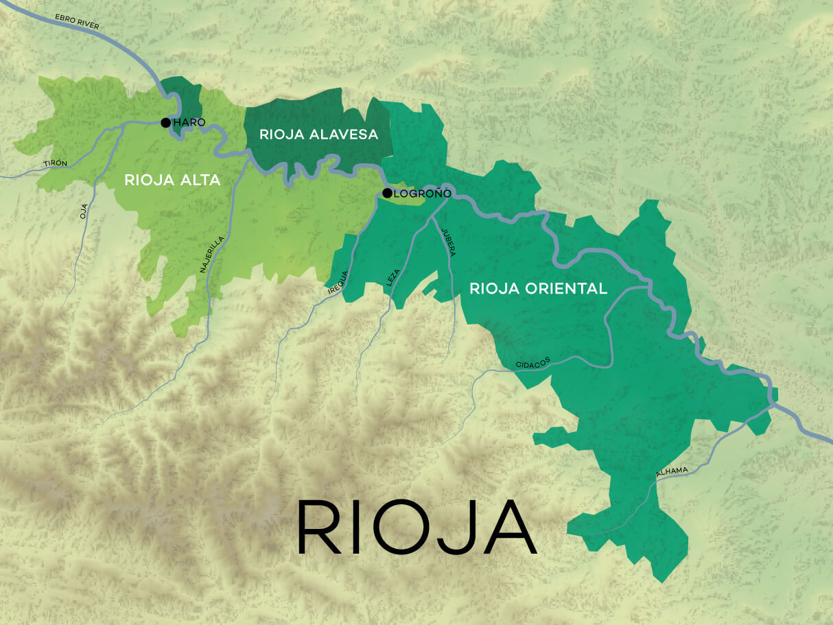 三分鐘讀懂Rioja三大子產區Rioja位在西班牙北中部,沿著伊布羅河展開,一路被山脈環抱。Sierra Cantabria 像一道天然屏障,攔住從外海帶來的雲層與濕氣,讓山谷內氣候相對穩定、日照充足,既適合葡萄成熟,又保留足夠涼意與日夜溫差。整個 Rioja 大致分成三個子產區:Oriental、Alta 與 Alavesa。 Rioja三個子產區地圖位置 (圖/media.winefolly.com)