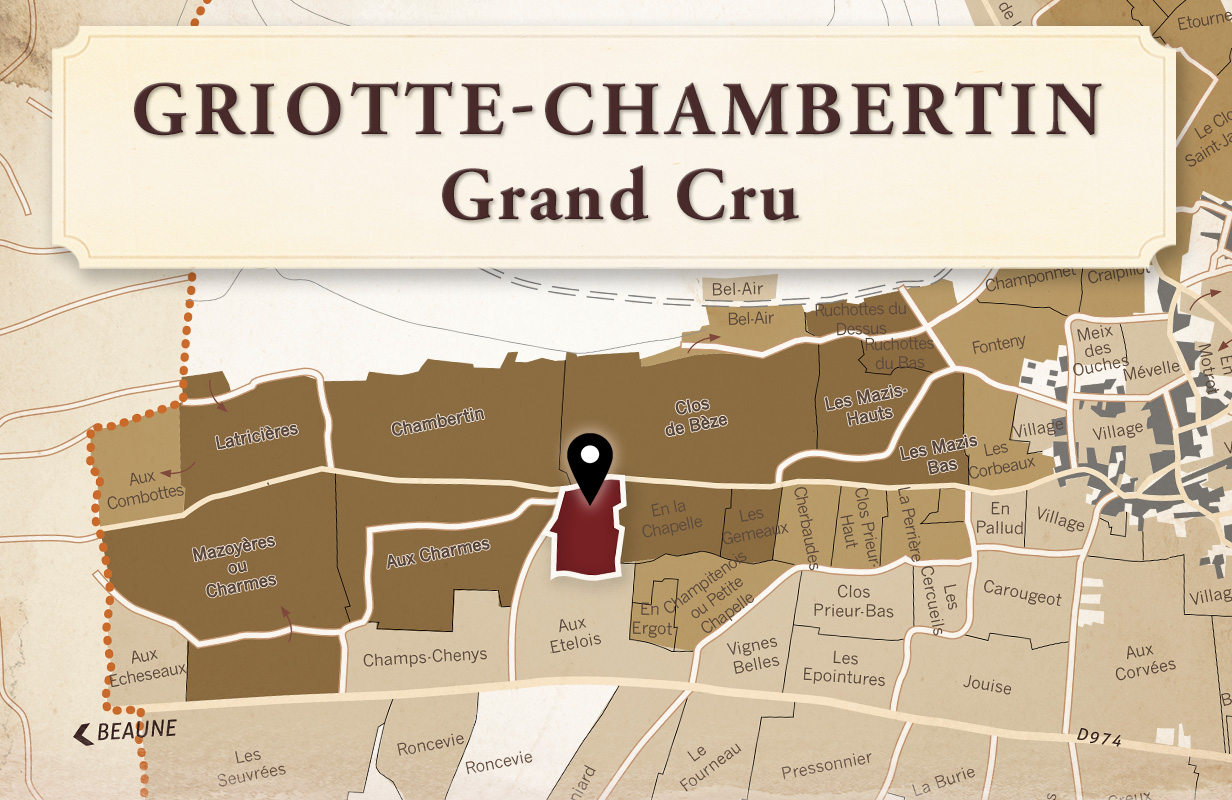 在Gevrey-Chambertin九座紅酒特級園之中,Griotte-Chambertin的正式核准面積只有約2.6–2.7公頃,是家族裡真正的「袖珍寶石」,同時也是整個產區中產量最少的Grand Cru 之一。葡萄園位於坡腳略往上的位置,座落在Route des Grands Crus東側緩坡,西邊隔著道路就是Chambertin本園,北接Chapelle-Chambertin,南連Charmes-Chambertin,東側則已是村莊級Gevrey-Chambertin地塊,等於被Chambertin家族環抱在正中央。
