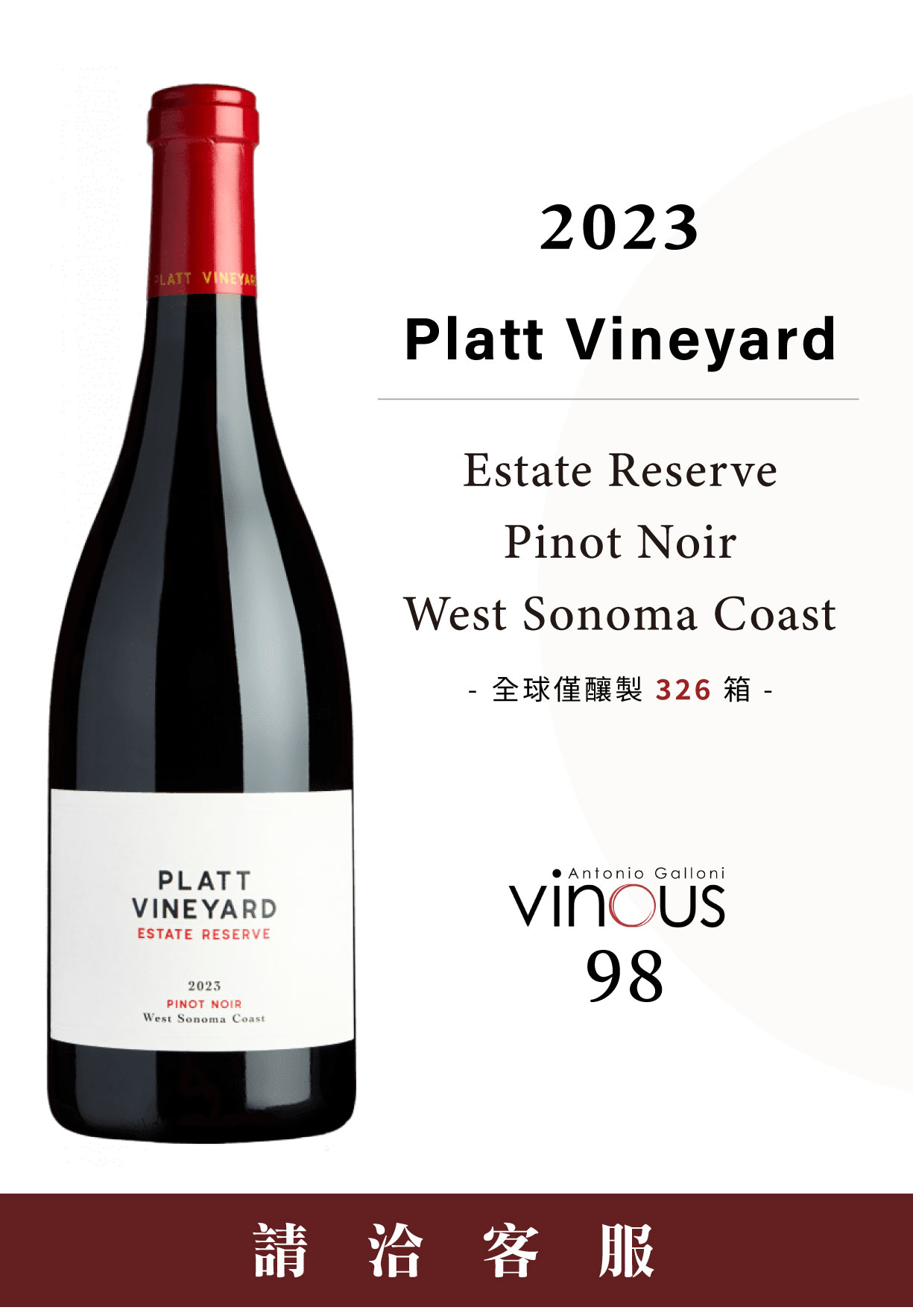 此報價僅限活動期間 2026/04/07~2026/04/17 由於葡萄酒價易受極端氣候減產、國際運輸價格上漲以及市場供需變化影響,活動期限後請以客服人員回覆之實際報價為準。 《Vinous》:「這款2023 Chardonnay Estate Reserve出色至極。橘皮、榛果、香料、薄荷、烤蘋果塔以及點心糕點的香氣,是酒杯中悠然綻放的眾多細膩風味。這款Reserve展現了活力與質地稠密度之間迷人的交融。奶油般圓潤且具共鳴的輪廓,完美收束了絲滑豐滿的結尾。其濃郁度驚人,整體的平衡感更是令人讚嘆,與那彷彿能迴盪至永恆的悠長餘韻相得益彰。 這是我在West Sonoma Coast品嚐過、足以證明Chardonnay最終潛力可能超越Pinot Noir的幾款佳釀之一。真是款了不起的傑作!」 酒評家James Suckling更盛讚:「Reserve Chardonnay 白花、燧石與純淨果香縈繞鼻息,令人聯想到勃根地Ramonet的白酒。」 品飲筆記:精選老藤的最佳批次,匯集莊園內3個地塊的精華,展現出這片風土罕見的深度與礦物張力。 質地帶有顯著的粉筆觸感,緊實的核心散發出鮮桃、柑橘、野茴香與橙花香氣。柑橘油脂般的質地層層鋪陳,襯托出果實、杏仁膏、海霧與碎白岩的豐富層次。橡木桶風味完美融入,賦予了酒體分量與結構,餘韻悠長,細膩礦石感縈繞不散。 此報價僅限活動期間 2026/04/07~2026/04/17 由於葡萄酒價易受極端氣候減產、國際運輸價格上漲以及市場供需變化影響,活動期限後請以客服人員回覆之實際報價為準。 《Vinous》:「這款2023 Chardonnay (West Sonoma Coast)是一場極為出色的首發亮相。明亮且芳香四溢,2023年份酒款以其活力、細膩層次與清晰的線條感令人印象深刻。油封柑橘(Citrus confit)、白胡椒、橘皮、板岩與碎石香氣在杯中展現出美妙的生命力。爽脆的酸度在收尾時將整體風味完美凝聚。 Platt是一塊神奇的土地,這種特質在這款動人且姿態優雅的Chardonnay中表露無遺。與Reserve酒款對比品嚐時,這款West Sonoma Coast Chardonnay的風味更偏向於柑橘與板岩礦物感的譜系。」 品飲筆記:以鮮明燧石還原氣息揭幕,隨後湧現檸檬萊姆皮、碎牡蠣殼、青蘋果及馬鞭草。隨酒液在杯中舒展,透出榛果碎、杏桃、沿岸草本、白李與梅爾檸檬塔。酸度亮麗有張力,收尾精準犀利且帶有引人入勝的鹹感。 此報價僅限活動期間 2026/04/07~2026/04/17 由於葡萄酒價易受極端氣候減產、國際運輸價格上漲以及市場供需變化影響,活動期限後請以客服人員回覆之實際報價為準。 《Vinous》:「這款2023 Pinot Noir Estate Reserve以血橙、紅石榴、香料、新皮革與雪松等充滿異國情調的風味交織,深刻地浸染著味蕾。作為一款擁有極佳稠密度與純粹力量感的Pinot,這款2023 Platt仍需時間褪去些許稚嫩的豐腴感。這是產自美國最卓越地塊之一的典範之作。」 品飲筆記:薰衣草與鼠尾草芬芳交織深色漿果,鮮明礦物還原感賦予酒體清爽絲滑。口中盈滿黑紫果實、血橙與甘草氣息,隱見松針、紫羅蘭、黑茶與丁香。中段由成熟果皮單寧增添飽滿分量,最終以精煉優雅姿態悠長收尾。 此報價僅限活動期間 2026/04/07~2026/04/17 由於葡萄酒價易受極端氣候減產、國際運輸價格上漲以及市場供需變化影響,活動期限後請以客服人員回覆之實際報價為準。 《Vinous》:「這款2023Pinot Noir(West Sonoma Coast)是這間新酒莊的另一款絕佳佳作。濃郁的深色櫻桃與李子果香、香料、薄荷、甘草、焚香、丁香、新皮革氣息,伴隨著一抹French oak的風味在味蕾上奔馳。碎玫瑰花瓣、薄荷、肉桂、香料與雪松的香氣也都被優雅地突顯出來。」 品飲筆記:野草莓、櫻桃、石榴與黑樹莓的鮮活果香中綻放出木槿花芬芳,並交織著龍蒿、玫瑰花瓣、橙皮與濕石的氣息,末端帶有丁香、肉豆蔻及濕土的深邃層次。單寧感細緻,現已展現迷人風采,未來數年的發展更值得期待。 |