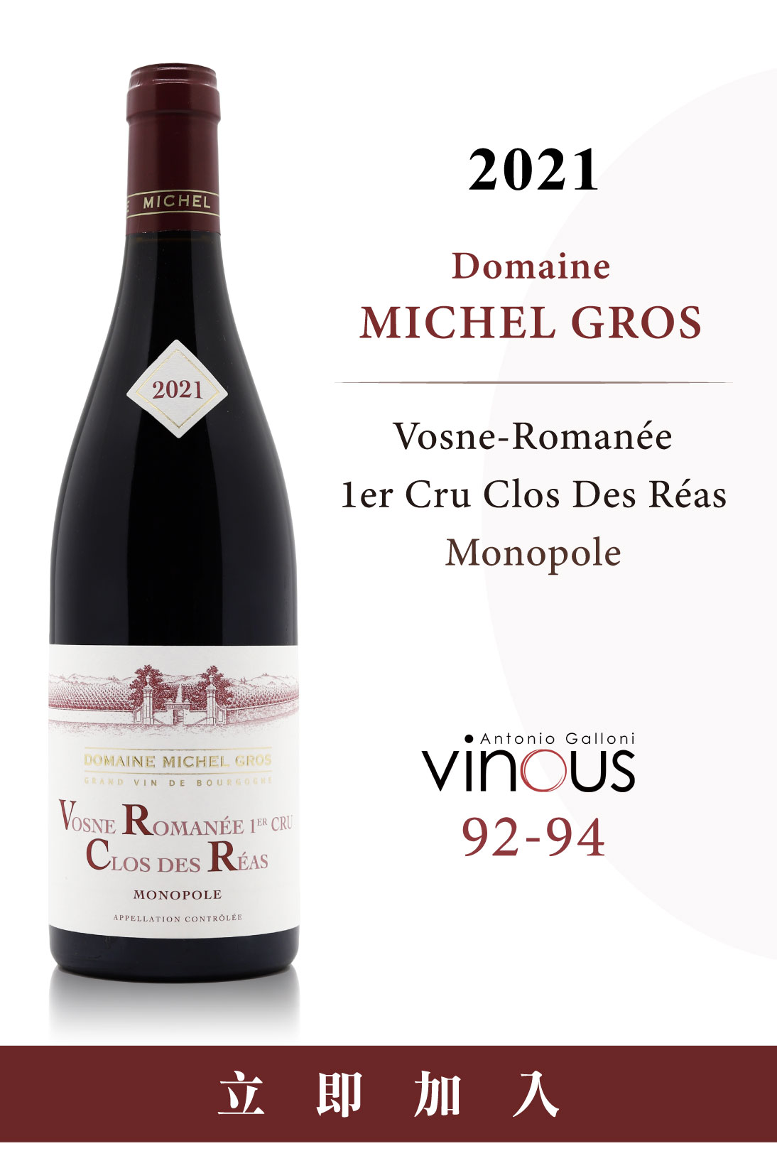 這份「寧要頂尖獨佔園,不要零碎特級園」的執著,讓Clos des Réas成為Vosne-Romanée 村內唯一的一級獨佔園(1er Cru Monopole) 。在勃根地權威Steen Öhman 的筆下,這塊園地不只是旗艦,更是 Michel Gros 的招牌之作。