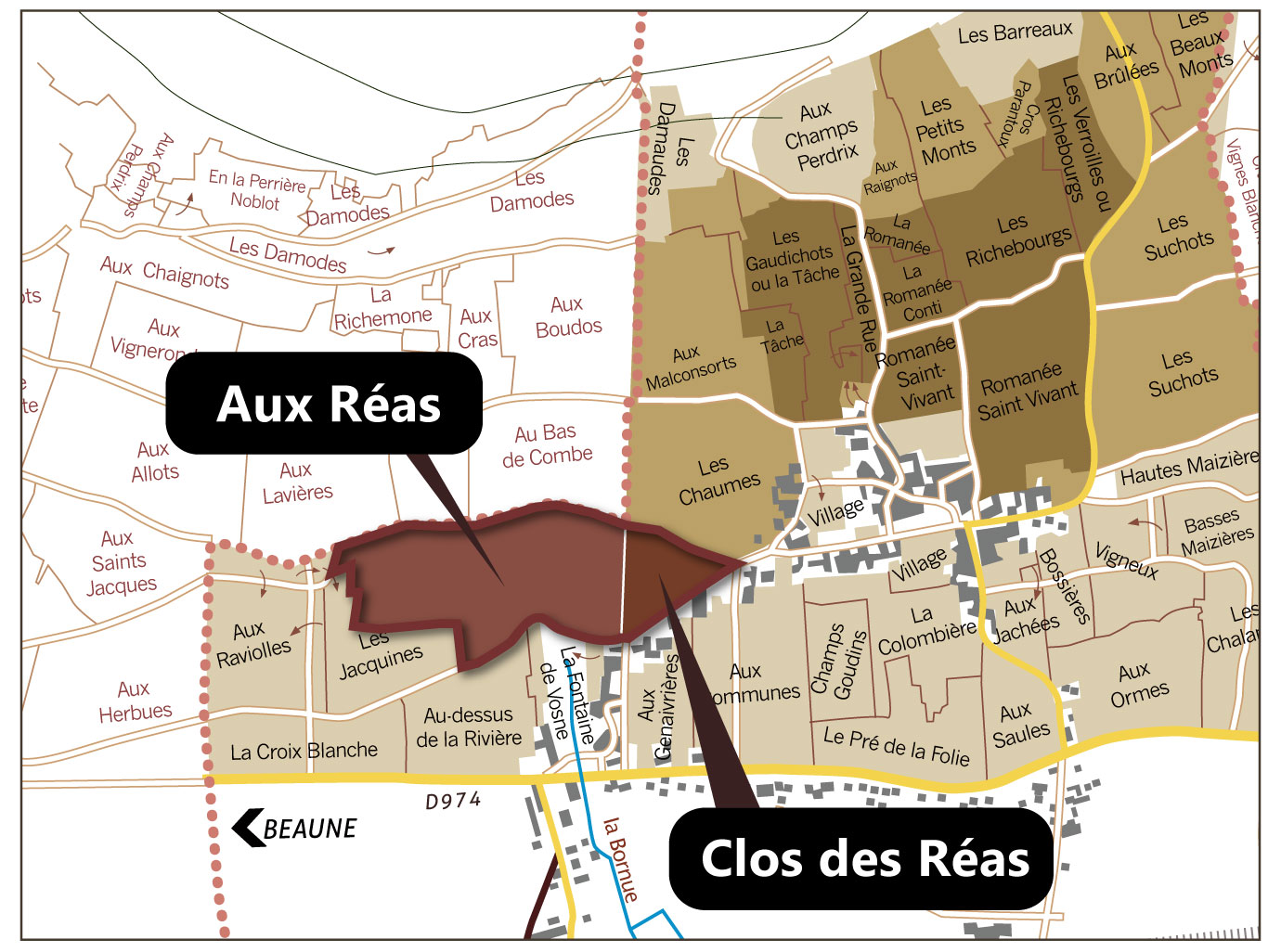 牆外,則是眾多名家共同耕耘的優質地塊Aux Réas。雖然AOC級別為村莊級,但其優越的地理位置與風土實力,吸引了如 Anne-Françoise (Domaine A.-F. Gros) 等頂尖釀造者在此一展長才。A.-F. Gros 以其標誌性的「整串發酵」工藝,將這片土地釀出了超越等級的優雅與花香層次 ,成為 Aux Réas 眾多作品中最具代表性的標竿。