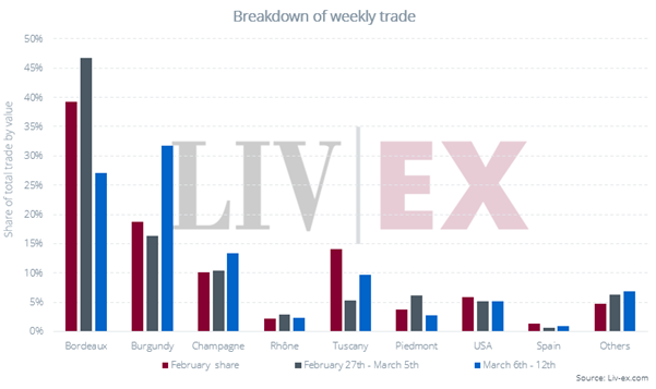 真正懂 DRC 的藏家,看的從來不只是酒標上的Romanée-Conti及稀缺性,而是Assortment套組背後的「編制秘密」。 Assortment的編制秘密收藏套組,絕非只是為了那瓶Romanée-Conti。Assortment的真面目,是Domaine de la Romanée-Conti對年份最優雅的調度:有時調整各款配比,有時破格納入Montrachet特級園白酒,每一次編制都是不可複製的絕響。 Romanée-Conti有時會納入 Montrachet特級園白酒做為收藏套組 (圖/grandcruliquidassets.com) 精品葡萄酒市場的抗跌堡壘根據2026年3月Liv-ex的週度報告,勃根地已佔整體交易值的32%,而DRC毫無懸念地蟬聯交易價值榜首。這不僅顯示其頂尖的流動性,更證明了DRC在市場震盪中作為「抗跌領頭羊」的核心地位。 Liv-ex反映的勃根地整體交易值 (圖/Liv-ex) 即便在整體環境波動時,2014 La Tâche仍能在2024年蘇富比拍賣中創下單瓶逾9,100歐元的紀錄,這種極強的價格支撐力,使其成為全球Fine Wine市場中少數具備「避險屬性」的指標資產。 |