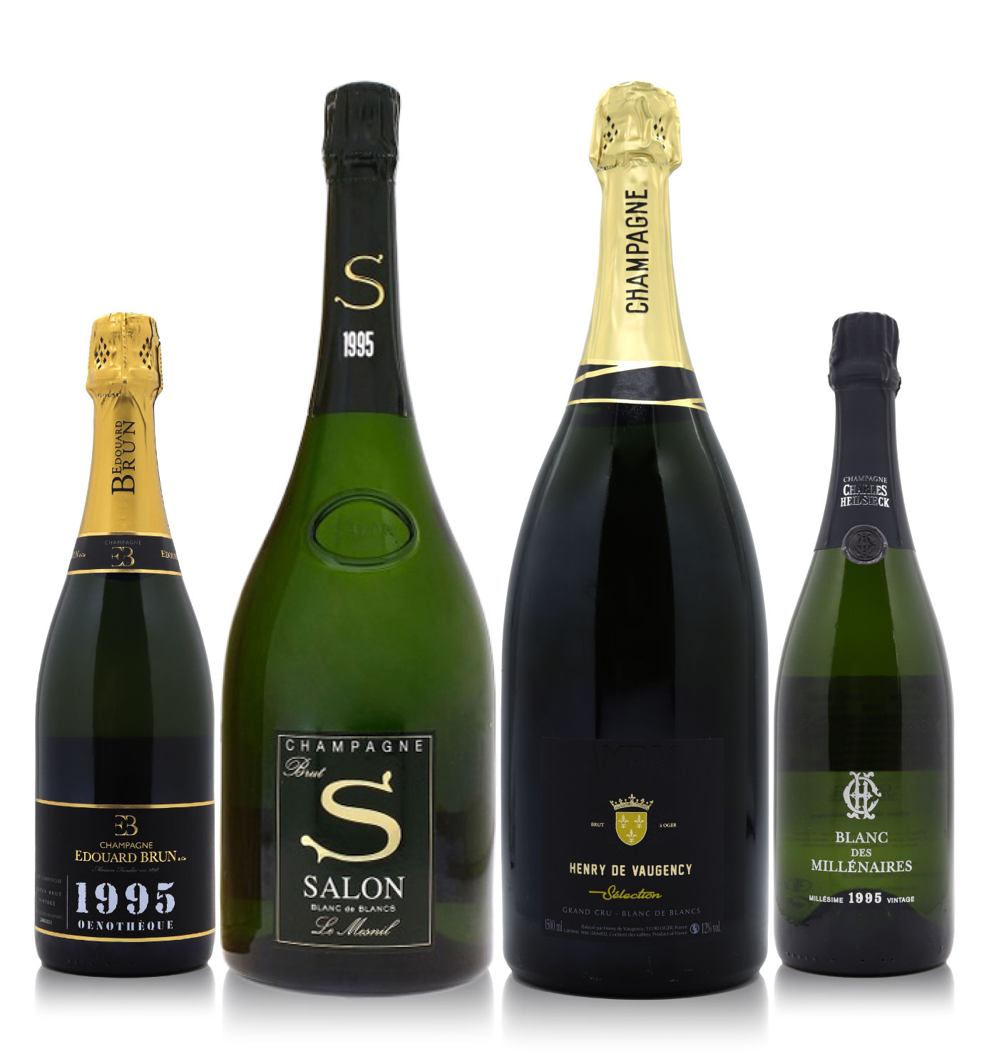 | 1 | 1995 Edouard Brun & Cie Oenotheque Extra Brut Gift Box (0.75L) | --- | 【立即加入】 | | 2 | 1995 Charles Heidsieck Blanc des Millenaires Blanc de Blancs Brut Gift Box (0.75L) | RP:96 | 【立即加入】 | | 3 | 1995 Philipponnat Clos des Goisses Long Vieillissement Extra Brut (0.75L) | RP:95 | 【立即加入】 | | 4 | 1995 Dom Perignon P2 Plenitude Brut Gift Box (0.75L) | JR:19/20 | 【立即加入】 | | 5 | 1995 Henry de Vaugency Selection Blanc de Blancs Grand Cru Brut Magnum (1.5L) | --- | 【立即加入】 | | 6 | 1995 Palmer & Co Collection Blanc de Blancs Brut Magnum (Deg:2024/05/13) (1.5L) | JR:17/20 | 【立即加入】 | | 7 | 1995 Salon Cuvee S Le Mesnil Blanc de Blancs Brut Magnum (1.5L) | --- | 【立即加入】 | |