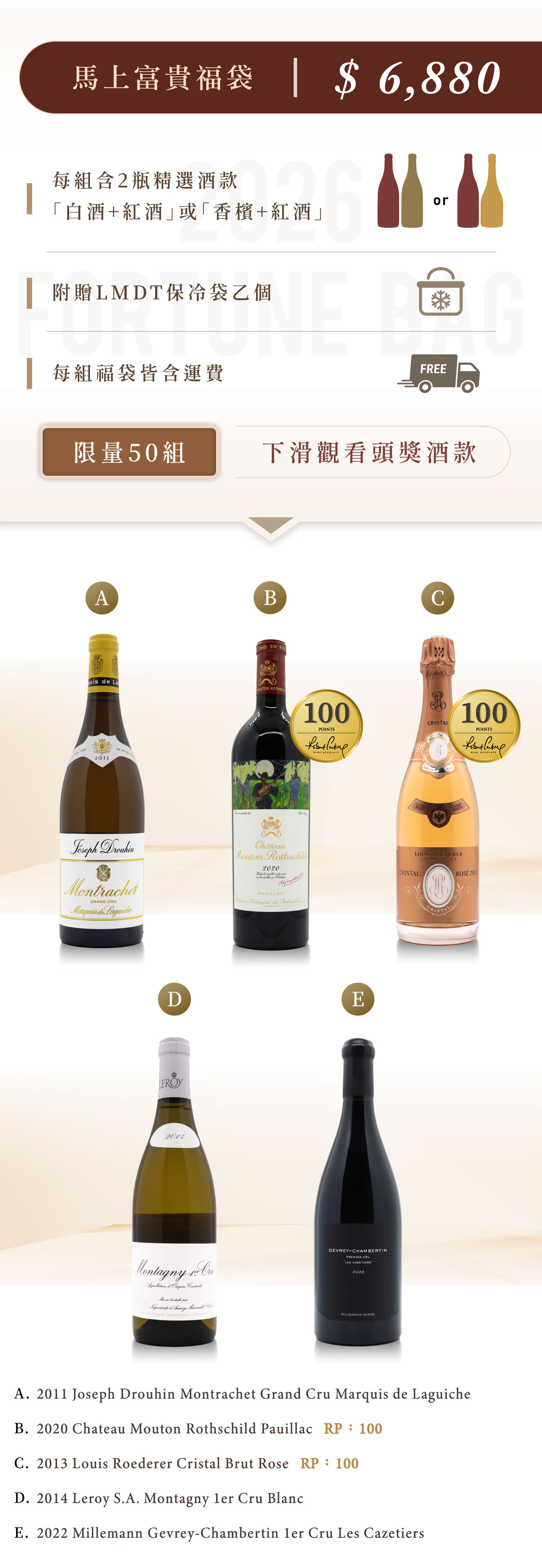 天地人酒窖回饋粉絲2025年的支持,為您精選一系列頂級美酒,推出限量新春福袋,讓您在新的一年馬上開運、馬上進寶、馬上富貴! 天地人酒窖今年推出的2026年新春限定福袋大升級,福袋內容絕對保本超值,另外擁有兩個加乘的抽獎機會:第一個是對應價位的「頭獎酒款」,每個價位都有5個頭獎名額 ; 第二個是購買福袋即可參加的「周邊好禮加碼」,首獎Code 38一名、二獎Terroir老酒開瓶神器+皮套五名、三獎Terroir 德國專利擦杯布十名,兩次抽獎的中獎率皆為10%以上,讓大家驚喜連連、好運不斷! |