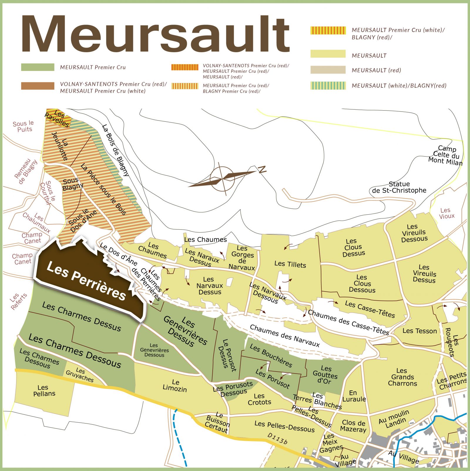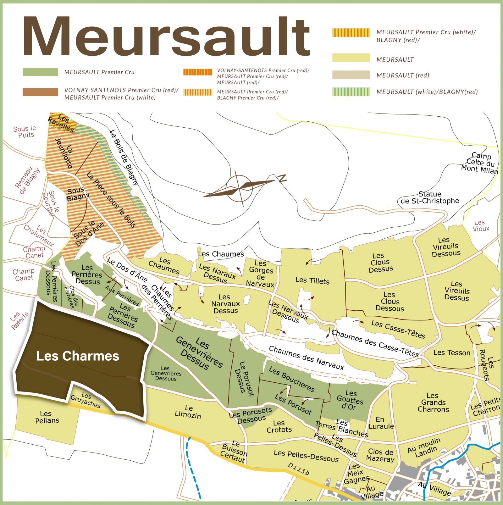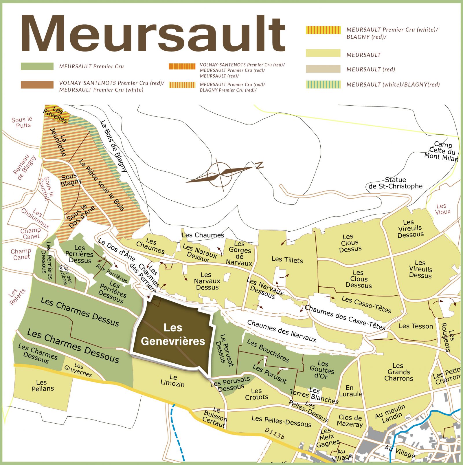 Les Genevrières 相較Perrières的「硬朗礦線」,Genevrières更常被形容為「香氣更開、更帶花香與柔緞質地」的版本 :在礦物基底之上,多一層更細緻、更迷人的芳香擴散。它仍保有Meursault的集中度與支撐力,但入口的圓融感通常更早出現,因此常被認為兼具「優雅與親和力」。