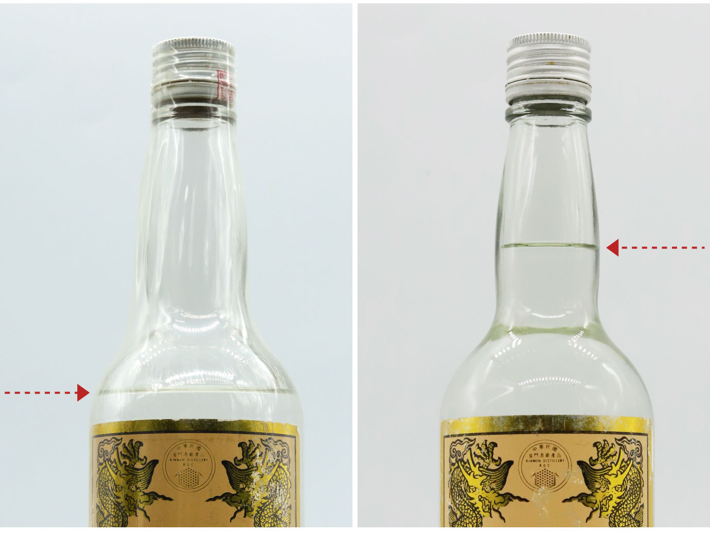 市面上的高粱老酒品質參差不齊,消費者購買往往像是在開盲盒。由於高粱酒酒精度數高、揮發性強,液面過低或失酒過多的酒款,常會導致風味受損,不僅觀感欠佳,也使價值大打折扣。相較之下,天地人酒窖所珍藏的黑金剛皆為保存狀況極佳的收藏級酒款,液面完整、品質純正,不僅適合鑑賞,更兼具文化與歷史價值! 兩款高粱酒的液面比對 (圖/天地人酒窖) |