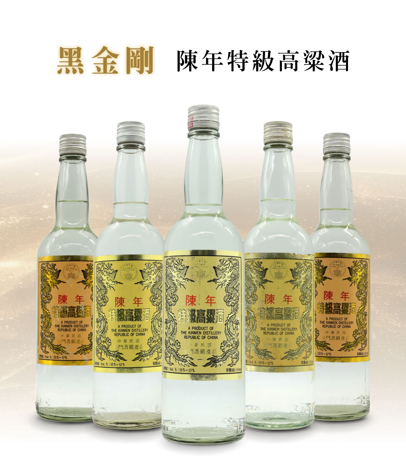 黑金剛的正式名稱為金門酒廠「陳年特級高粱酒」。酒標設計以黑色線條勾勒的燙金雙龍為主體,外框同樣以燙金裝飾,展現沉穩莊重的格調。在台灣軍管時期,黑金剛更被視為高階軍官與將領的專屬用酒,不僅是一款酒,更是一種權力與地位的象徵。 為了區隔軍中配給與一般市場販售,金門酒廠特別在內標印製數字標記。軍用版本依軍階劃分,數字愈小代表層級愈高,編號從10001至60006共分為六種。編號10001的版本,被行家稱作正統的「司令官黑金剛」或「司令酒」。然而在坊間,「黑金剛」早已不分版本,統稱為「司令酒」,也使它成為最具傳奇色彩的高粱酒代表。 釀造與風味特徵黑金剛的釀造為五年以上酒齡的純糧固態基酒,並調和少量老酒,以賦予酒體更清晰的層次與結構,酒精濃度介於55%至57%之間。與同廠的「陳高」、「白金龍」或「黑金龍」相比,黑金剛展現出更為清新卻不失厚實的風格,香氣集中而扎實,入口既有力度又保有細膩,形成獨特而鮮明的品飲體驗。
